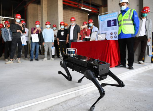 觀摩現(xiàn)場一只好動的巡檢機(jī)器狗在跳來跳去,它能夠代替人工到施工現(xiàn)場進(jìn)行工地巡檢,分析危險(xiǎn)源,識別火焰、煙霧、人員未佩戴安全帽、未穿反光背心等情況,極大提高危險(xiǎn)作業(yè)區(qū)域巡視管理效率及安全性;抹灰機(jī)器人通過高效振動和液壓提升,將砂漿平整的涂抹在墻面,解決高空作業(yè)及抹灰效能問題……