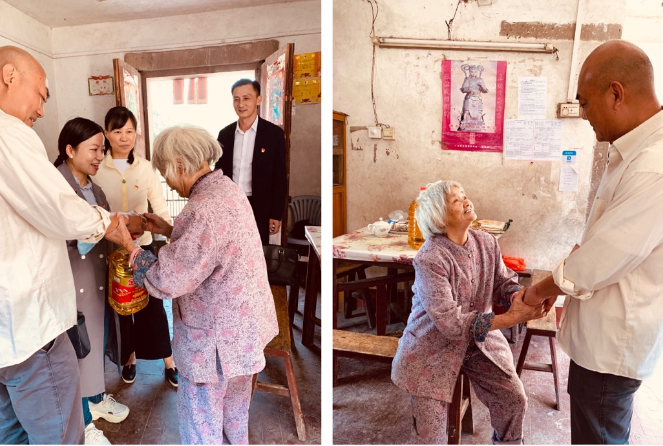 萬錦英老人家中有三口人,其 53歲的兒子在外打工的同時要照顧視力一級殘疾的孫子,所以老人在黎塘村老屋的家中常常是一個人居住,平時飲食起居全靠老人自己。蔡慶立同志駐村后經(jīng)常關(guān)心老人的身體生活狀況,噓寒問暖,甚至為老人量腳上網(wǎng)購買合適的鞋;老人屋后出入的木橋破舊,存在安全隱患,駐村工作隊為老人籌資修建了結(jié)實的鐵板橋和護欄。老人拉著前來探望她的陳蓉書記,眼含熱淚,對幫扶單位和駐村工作隊一再表示感謝。老人腰腿不好,我們離開時鎖好她家后門不讓她送,她堅持走出二樓門外,站在新修的鐵橋邊,依依不舍目送我們離開……